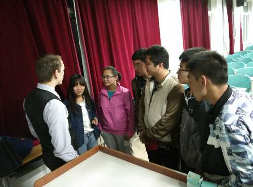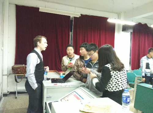 講座結(jié)束后,我們都還沉浸在上課的氣氛中。當(dāng)課程結(jié)束后,我們都還在等待,等待與Berrey講話(huà)的機(jī)會(huì),畢竟有許多事情想請(qǐng)教他。我們問(wèn)他是如何把中文學(xué)的這么好的時(shí)候,他說(shuō)高中時(shí)他就來(lái)到中國(guó)讀書(shū)。一開(kāi)始,Berrey什么都不會(huì),完全聽(tīng)不懂別人在說(shuō)什么,根本無(wú)法交流,但通過(guò)各種刻苦的學(xué)習(xí)和練習(xí),加上良好的語(yǔ)言環(huán)境,他的漢語(yǔ)水平有了非常大的提高。