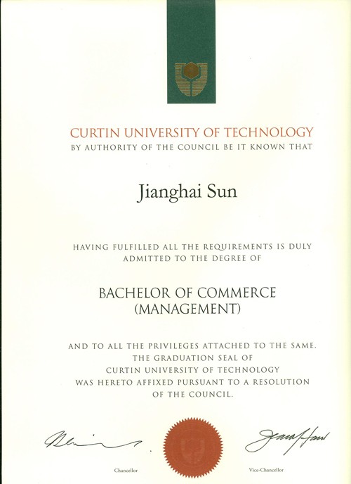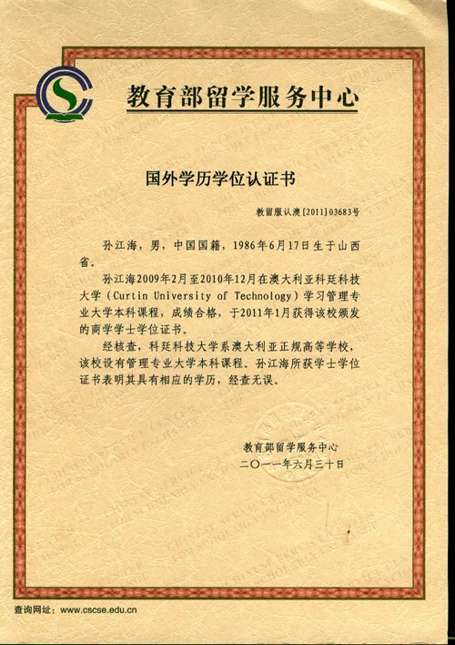 熱烈祝賀我院畢業(yè)生孫江海獲得澳大利亞科廷科技大學(xué)商學(xué)學(xué)士學(xué)位證書(shū),并通過(guò)教育部留學(xué)服務(wù)中心對(duì)其國(guó)外學(xué)歷學(xué)位的認(rèn)證。我院與海外名校進(jìn)行實(shí)質(zhì)性合作,2+2對(duì)接課程效果顯著。